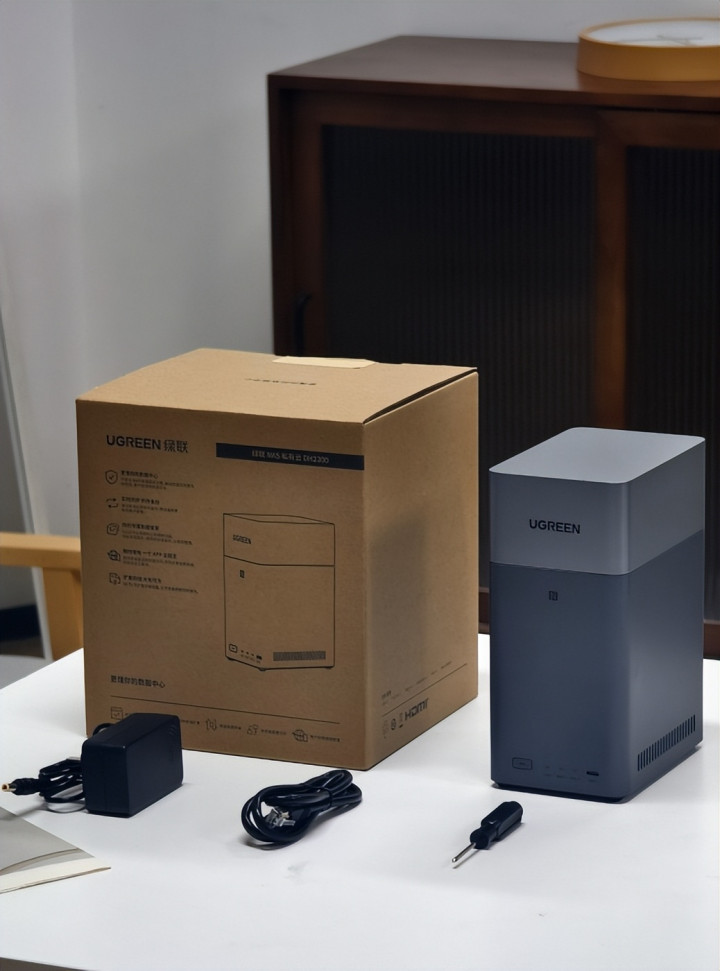 收到货时老公特别惊喜,机身是沉稳的灰黑色,大小和厚词典差不多,放客厅电视柜角落完全不突兀。我本来怕NAS设置复杂,结果全程图文引导,不用懂专业术语。最省心的是NFC功能,手机贴机身一下就跳转安装绿联云APP,插好硬盘十分钟就搞定所有设置,我这种数码小白也能独立操作。